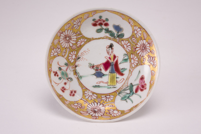 Famille rose schoteltje met in vier uitsparingen meerkleurige decors. Hieromheen opgevuld met witte bloempjes op een goudkleurige ondergrond. (Nederlands)