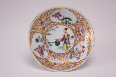 Famille rose schoteltje met in vier uitsparingen meerkleurige decors. Hieromheen opgevuld met witte bloempjes op een goudkleurige ondergrond.
