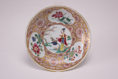 Famille rose schoteltje met in vier uitsparingen meerkleurige decors. Hieromheen opgevuld met witte bloempjes op een goudkleurige ondergrond. (Nederlands)