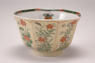 Acht-kantig kommetje met op de buitenzijde een fijn bloemdecor in groen en ijzerrood op een cafe au lait ondergrond, Van Diepencollectie, JMD-P-1537 |