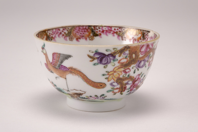 Schoteltje op voetring, spreidende wand. In China onversierd, gedecoreerd in emailkleuren met een tuinlandschap. Rechts een fazant met opgetrokken poot staand op een rotsblok, daarnaast een zittende fazant. Links een bloeiende boom, de stam aan de zijkant voortkomend uit de bloemenrand langs de kant. Eenzelfde bloemenrand langs de binnenkant van de koppen. Binnenin op de bodem van de koppen een bloempje. (Nederlands)