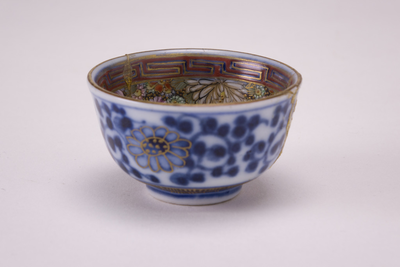 Klein kommetje met donkerblauwe, gouden en ijzerrode decors. Op de binnenzijde een ijzerrode met gouden meanderband. Hieronder een zeer druk bloemdecor (mille fleurs?).