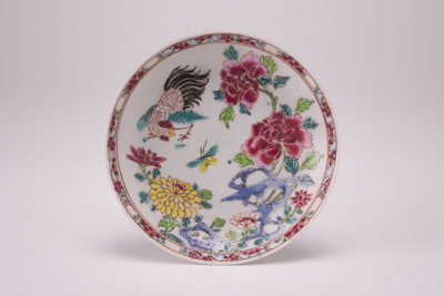 Famille rose schoteltje met op het plat pioenrozen en een haan. Yung-cheng. (Nederlands)