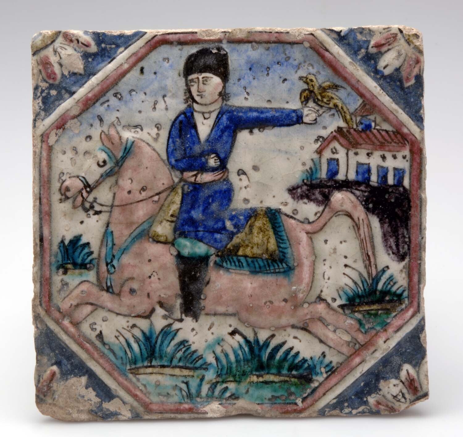 Geglazuurde aardewerken wandtegel met een afbeelding in reliëf van een man te paard (Nederlands)