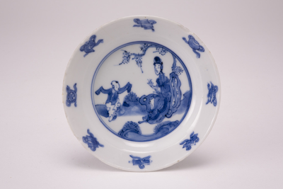 Wit schoteltje met op de rand zes tekens en op het plat een blauw lijzen en zotjes decor, Van Diepencollectie, JMD-P-1551 |