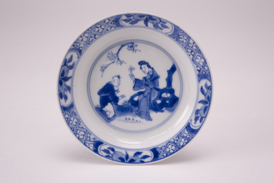 Wit schoteltje met blauwe bewerkte rand en op het plat een blauw lijzen en zotjes decor, Van Diepencollectie, JMD-P-1560 |