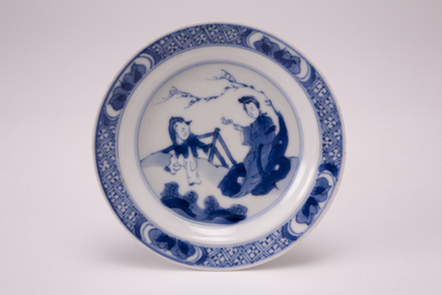 Wit schoteltje met blauwe bewerkte rand en op het plat een blauw lijzen en zotjes decor.