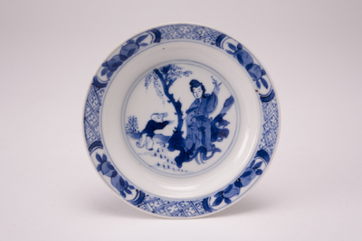 Wit schoteltje met blauwe bewerkte rand en op het plat een blauw lijzen en zotjes decor.