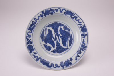 Dish on footring, wide flat rim. Decorated in underglaze blue with two flying cranes and cloud motifs. The sides undecorated, on the rim peach branches and auspicious symbols with ribbons. On the reverse four flower sprays and four auspicious symbols. On the reverse of the sides two peach branches. On the base the four-character mark Da Ming nian zao (made during the great Ming). (Engels)