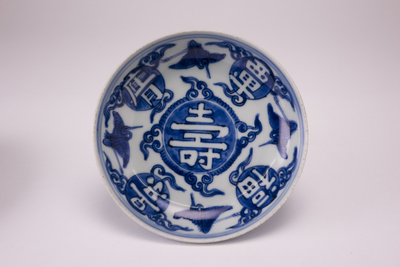Grof blauw Ming schoteltje met in het midden het teken Chou (geluk) met hieromheen nog vier tekens en vier kraanvogels, Van Diepencollectie, JMD-P-1567 |