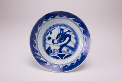 Wit schoteltje met donkerblauwe rand en op het plat een donkerblauwe draak en een karper.