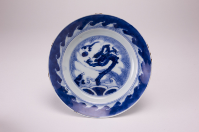Wit schoteltje met donkerblauwe rand en op het plat een donkerblauwe draak en een karper, Van Diepencollectie, JMD-P-1569 |