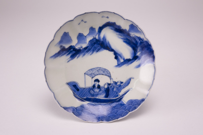 Witte schotel mert gegolfde rand en op het plat een blauwe tekening met een berglandschap en drie chinezen in een boot. Aan de hemel staan enkele sterren.