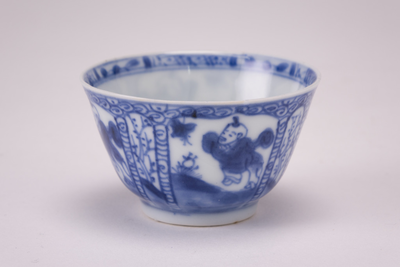 Wit kommetje met aan de binnenzijde een blauwe band. Op de buitenzijde vier blauwe zotjes in blauwe kadertjes. (Nederlands)