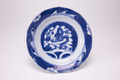 Wit schoteltje met donkerblauwe rand en op het plat een donkerblauwe draak en een karper.