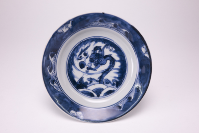 Wit schoteltje met donkerblauwe rand en op het plat een donkerblauwe draak en een karper.