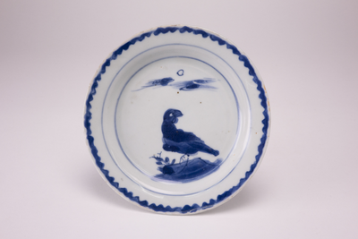 Small dish on footring, flat rim. Decorated in underglaze blue with a bird of prey on a rock. Above clouds and a moon. On the rim a scalloped band. The reverse is undecorated. Kiln-sand adhering to the base. (Engels)