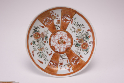 Dunne schotel met op het plat oranje-rode goud gearceerde vlakken en witte vlakken (met groen bloemdecor) rond een cirkel.