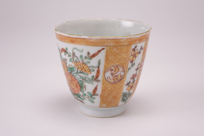 Hoge kop met op de buitenzijde oranje-rode goud gearceerde vlakken en witte vlakken (met groen bloemdecor).