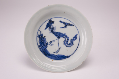 Small saucer on footring, wide flat rim. Decorated in underglaze blue with a striding phoenix in a schematically rendered landscape with a cloud motif. The sides and rim are undecorated. On the base a mark in seal script, possibly shou (long life). (Engels)