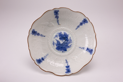 Wit schaaltje met gegolfde bruine lip met op de binnenzijde, in reliëf, zes segmenten met decoraties. In het midden en tussen de segmenten blauwe bloemdecoraties.