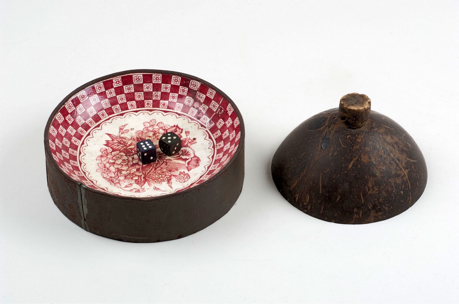 Bord van aardewerk (a) van (kansspel bestaande uit bord van aardewerk a klapperdop met kurken dop b en twee dobbelstenen c) (Nederlands)