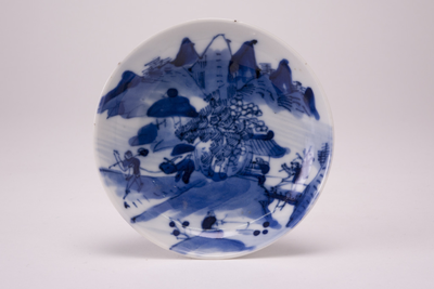 Wit schoteltje met blauw landschapdecor met diverse personen.