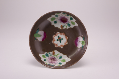 Caupcijner schoteltje met in het bruin vijf uitsparingen met hierin een bloem- of vruchtdecoratie.