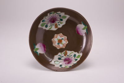 Capucijner schoteltje met in het bruin vijf uitsparingen met hierin een bloem- of vruchtdecoratie.