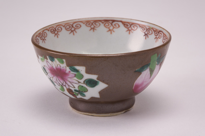 Capucijner kommetje met langs de binnenrand een ijzerrode bandversiering. Aan de buitenzijde, in het bruin, vier uitsparingen met hierin een bloem- of vruchtdecoratie (perzik). (Nederlands)