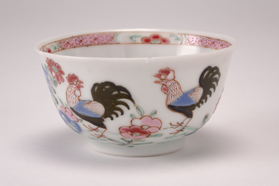 Famille rose kommetje met aan de binnenrand een roze bandversiering. Aan de buitenzijde twee hanen en een pioenroos in roze zwart en blauw.