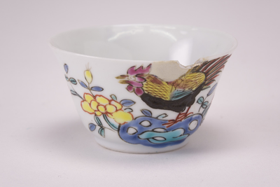 Famille rose kommetje met op de buitenzijde pioenrozen, een haan en een rots. Yung-cheng. (Nederlands)