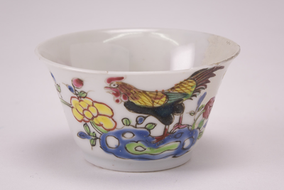 Famille rose kommetje met op de buitenzijde pioenrozen, een haan en een rots. Yung-cheng. (Nederlands)