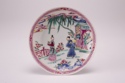 Wit schoteltje met op de voorzijde een famille rose decor met lijzen.