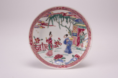Wit schoteltje met op de voorzijde een famille rose decor met lijzen.