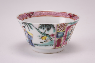 Famille rose kommetje met aan de binnenrand een roze bandversiering. Op de buitenzijde een famille rose decor met lijzen.