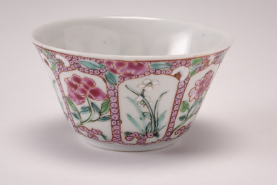 Witte kop met op de bodem een spaarzaam lakmoesdecor en veel roze en groen. Op de buitenzijde roze met groene bloemen.