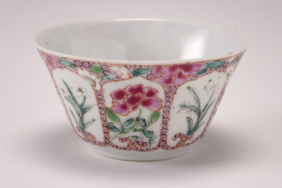 Witte kop met op de bodem een spaarzaam lakmoesdecor en veel roze en groen, Van Diepencollectie, JMD-P-1661 |