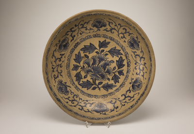 Groot fijn gecraquleerd lichtbruine schotel met op het plat fraaie blauwe bloemdecoraties. Hier omheen op de rand nogmaals een band met bloemen en takken.