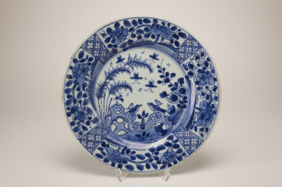 Blauw gedecoreerd plat wit bord met op de rand acht vlakken waarvan vier met bloemdecors en vier met kruisvlakjes. Op het plat een decoratie met planten, vogels en bijen. (Nederlands)
