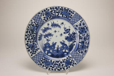 Blauw gedecoreerd plat wit bord met op de rand acht vlakken waarvan vier met bloemdecors en vier met kruisvlakjes. Op het plat een decoratie met planten, vogels en bijen. (Nederlands)