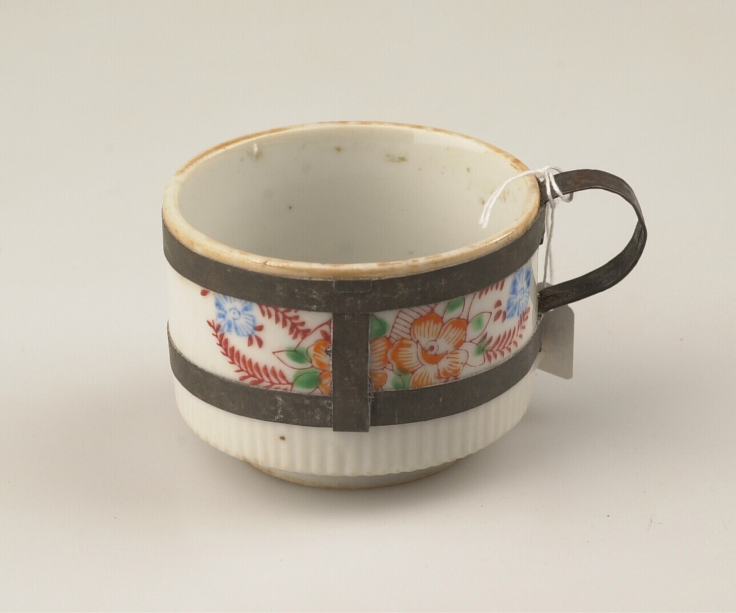 Porseleinen theekop met lijm en metalen band gerepareerd (Nederlands)