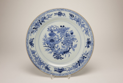 Plat blauw wit bord met op de lip een bruine lijn. Op de rand en op het plat fijne blauwe gearceerde bloemdecoraties en een bloemenmandje.