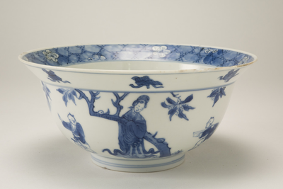Witte kom met op de binnenrand een brede blauwe band en op de buitenzijde blauwe decoraties met lijzen en zotjes.