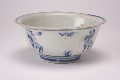 Grijs-witte kom met op de binnen- en buitenzijde blauwe decoraties met o.a. ruiters te paard. (Nederlands)