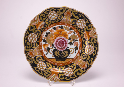 Geschulpt bord met lakmoes. In de uitsparingen ijzerrood en goud. In het centrum een zwarte vaas met een pioenroos in famille rose.
