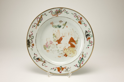 Famille verte bord met op de rand acht sybolische voorwerpen en op het plat drie jongetjes en een man (Hotei). (Nederlands)