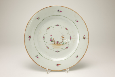 Wit dessertbordje met op de lip een bruine en een ijzerrode lijn. Op de rand acht ijle groen-roze bloempjes en op het plat in een ijle bloemenkrans twee kleine vogeltje op twee bruine takken. (Lowestoft) (Nederlands)