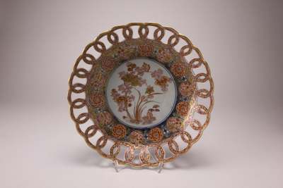 Imari schaal met opengewerkte (Olympiade)cirkelrand. Op het plat een fijn bloemdecor in blauw, goud, oranje en ijzerrood. (Nederlands)