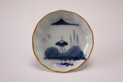 Wit schoteltje met gegolfde rand en op de lip een bruine lijn. Op het plat een blauw landschapdecor. (Nederlands)